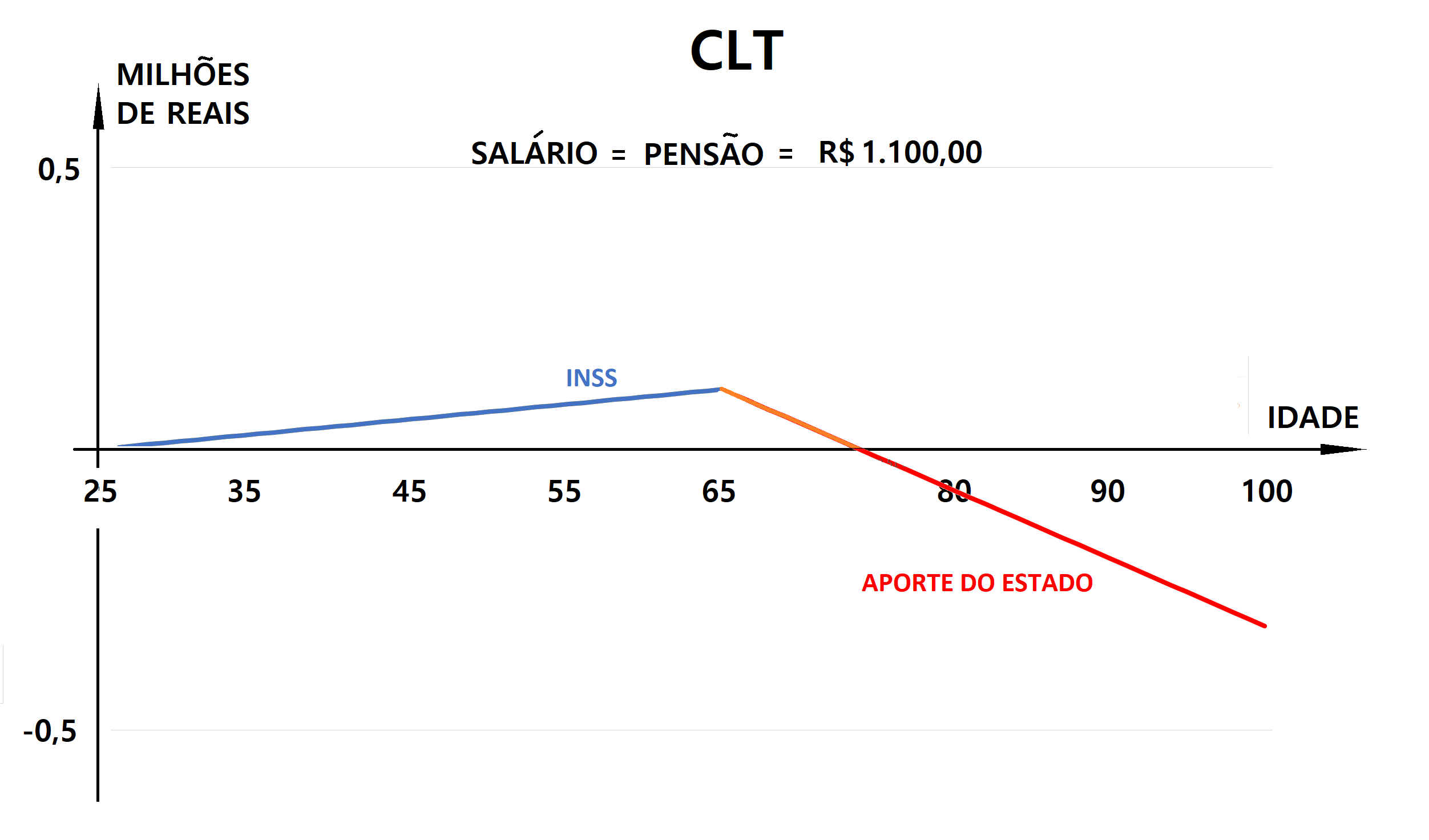 Vale lembrar que o total de contribuição ao INSS será acrescido de 11% pagos pelo empregador, o que totalizará 105.6 mil reais quando se aposentar. Esse montante fará com que ele possa receber uma pensão somente até os 73 anos, sem qualquer aporte do Estado, mas se viver até os 100 anos, o Estado terá que aportar 315 mil reais.