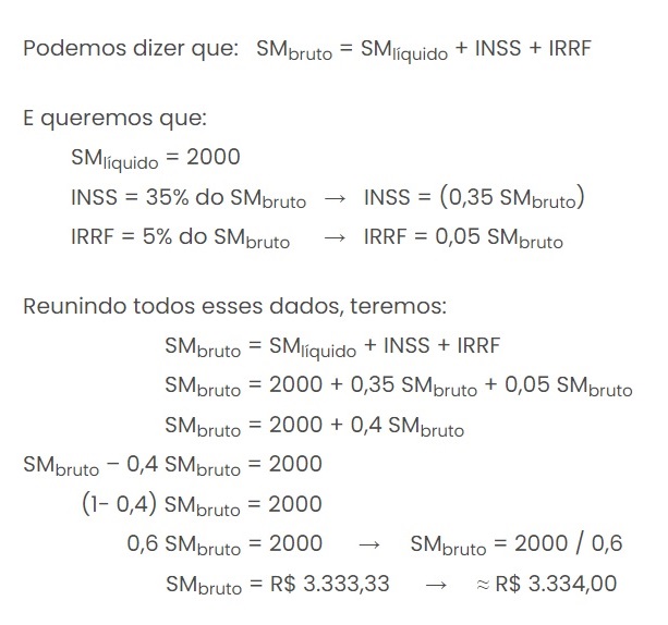 Portanto, se considerarmos que deveria sobrar na mão do trabalhador o equivalente a 2 mil reais, o SM deveria ser igual a R$.3.334,00.